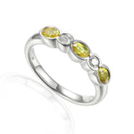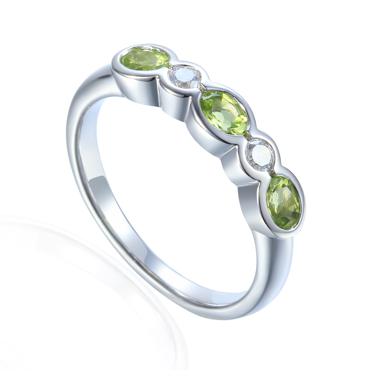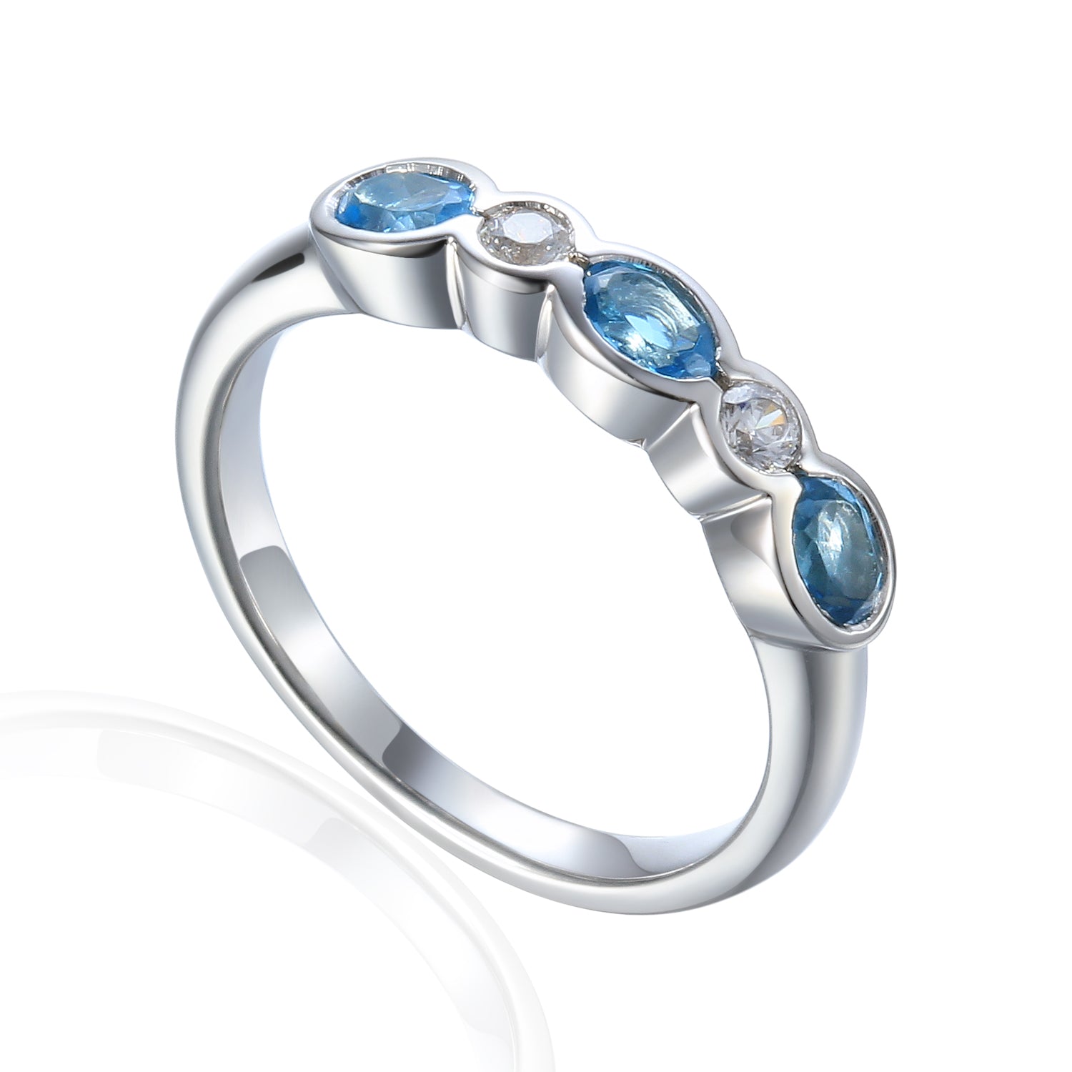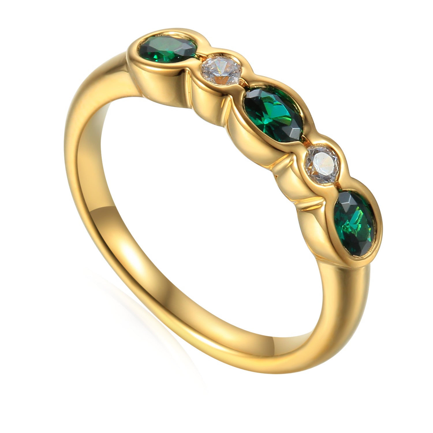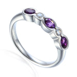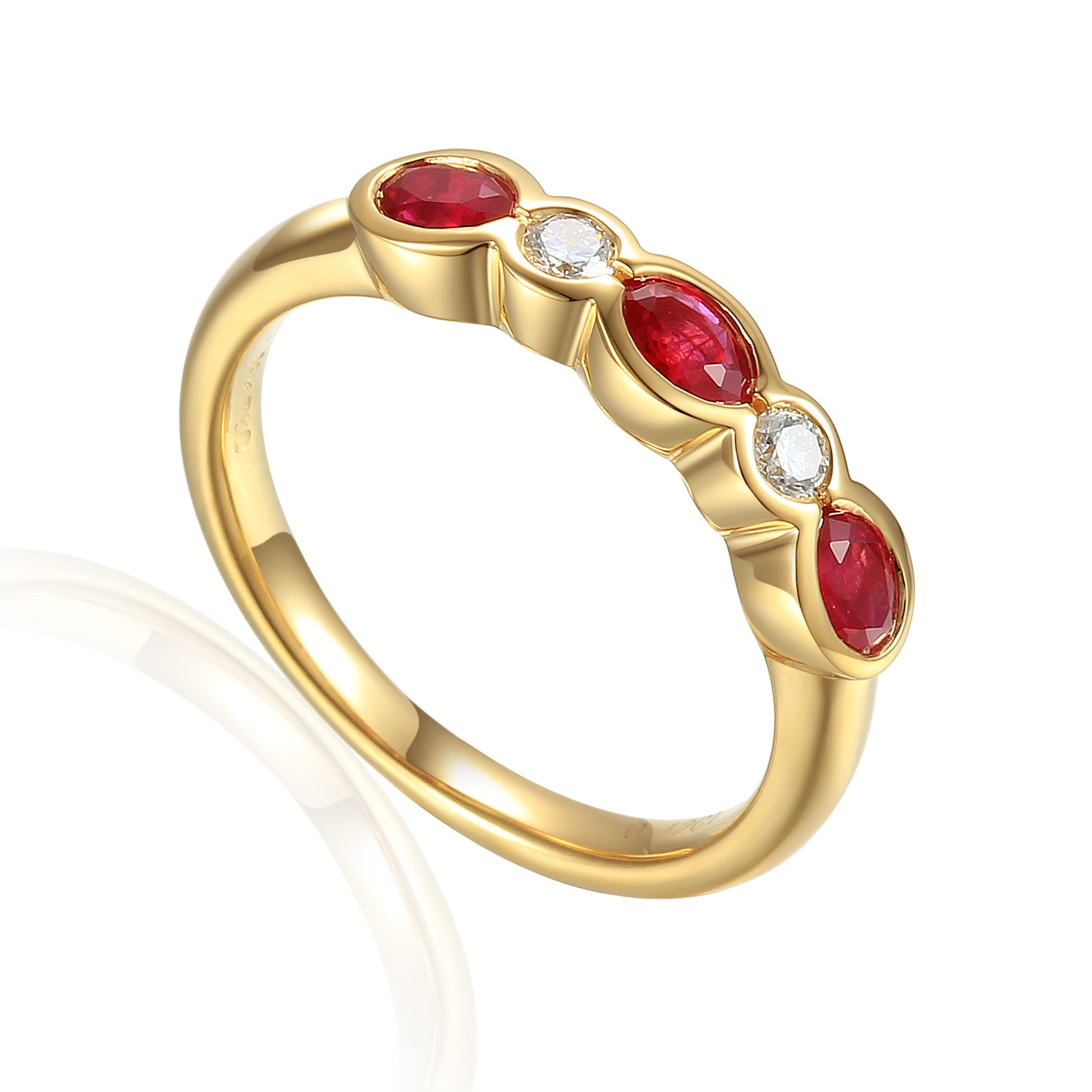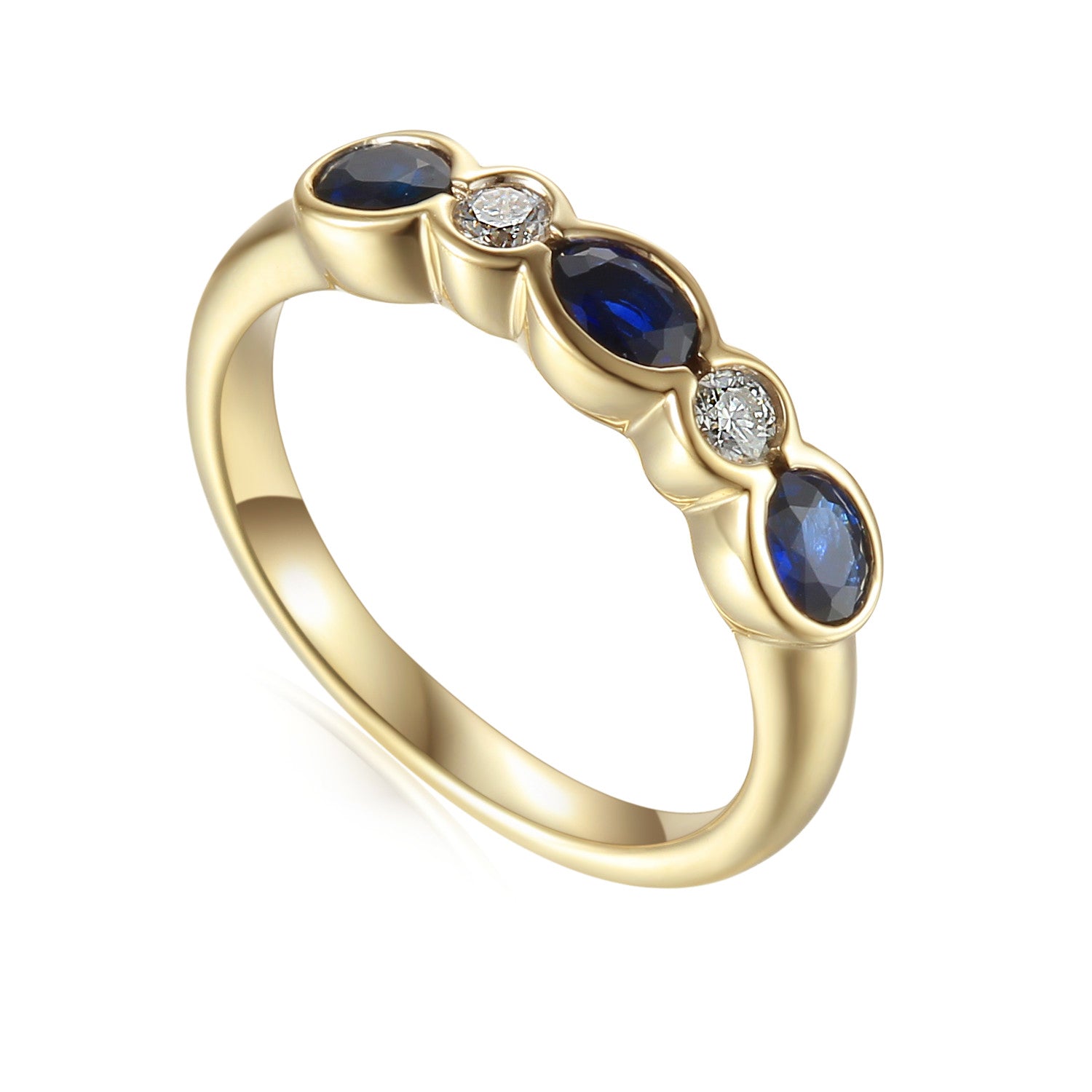 Three oval gemstones separated by two round diamonds in a rub over five stone eternity band.