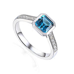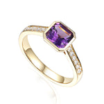 5mm octagon gemstone ring in a rubover setting with pave diamond shoulders
