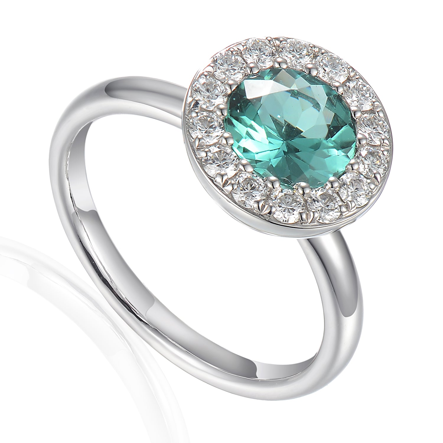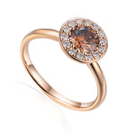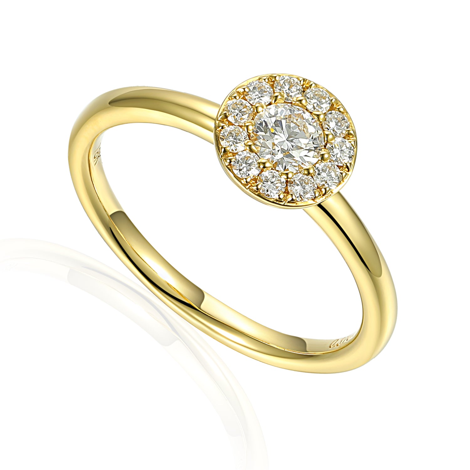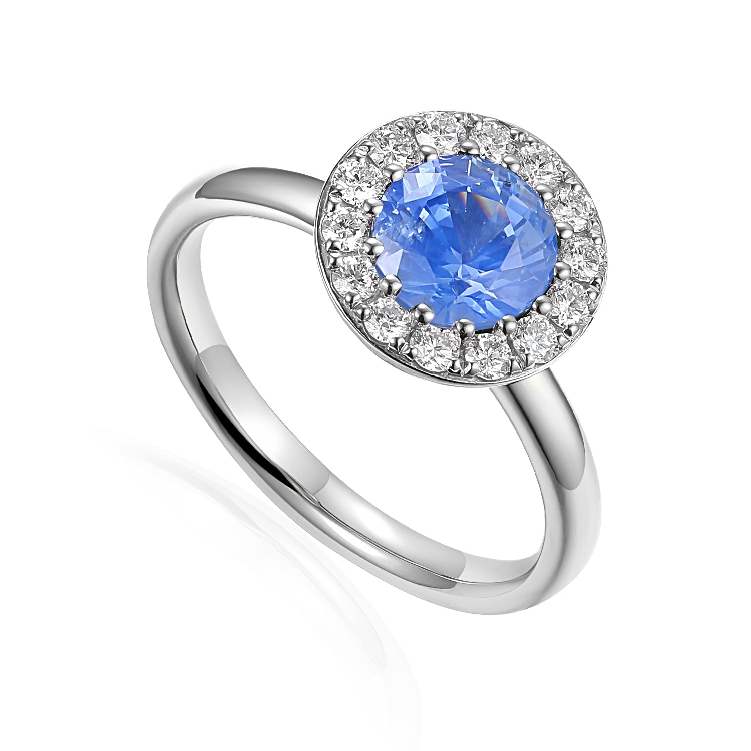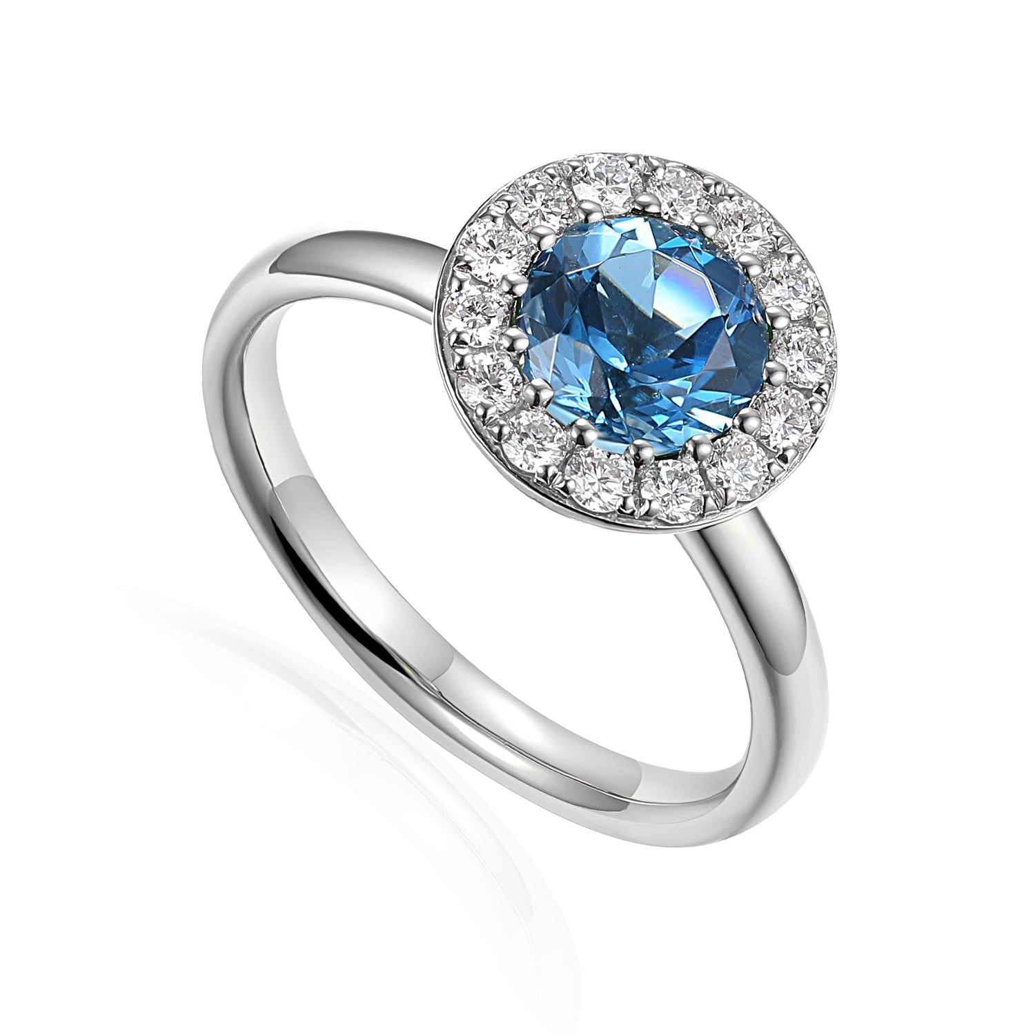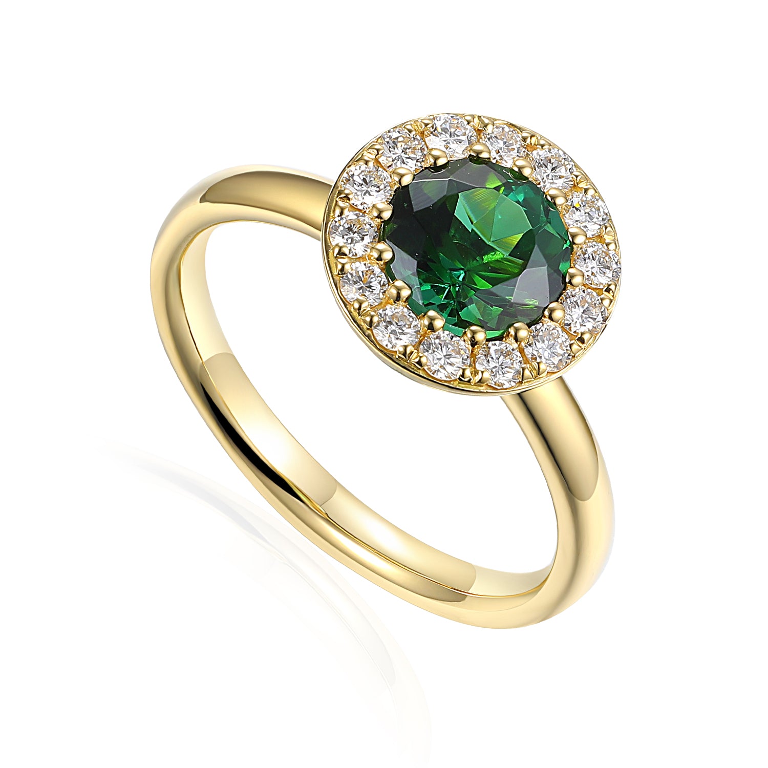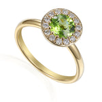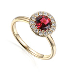 Gold ring set with round gemstone in a halo diamond surround on a plain rounded band