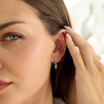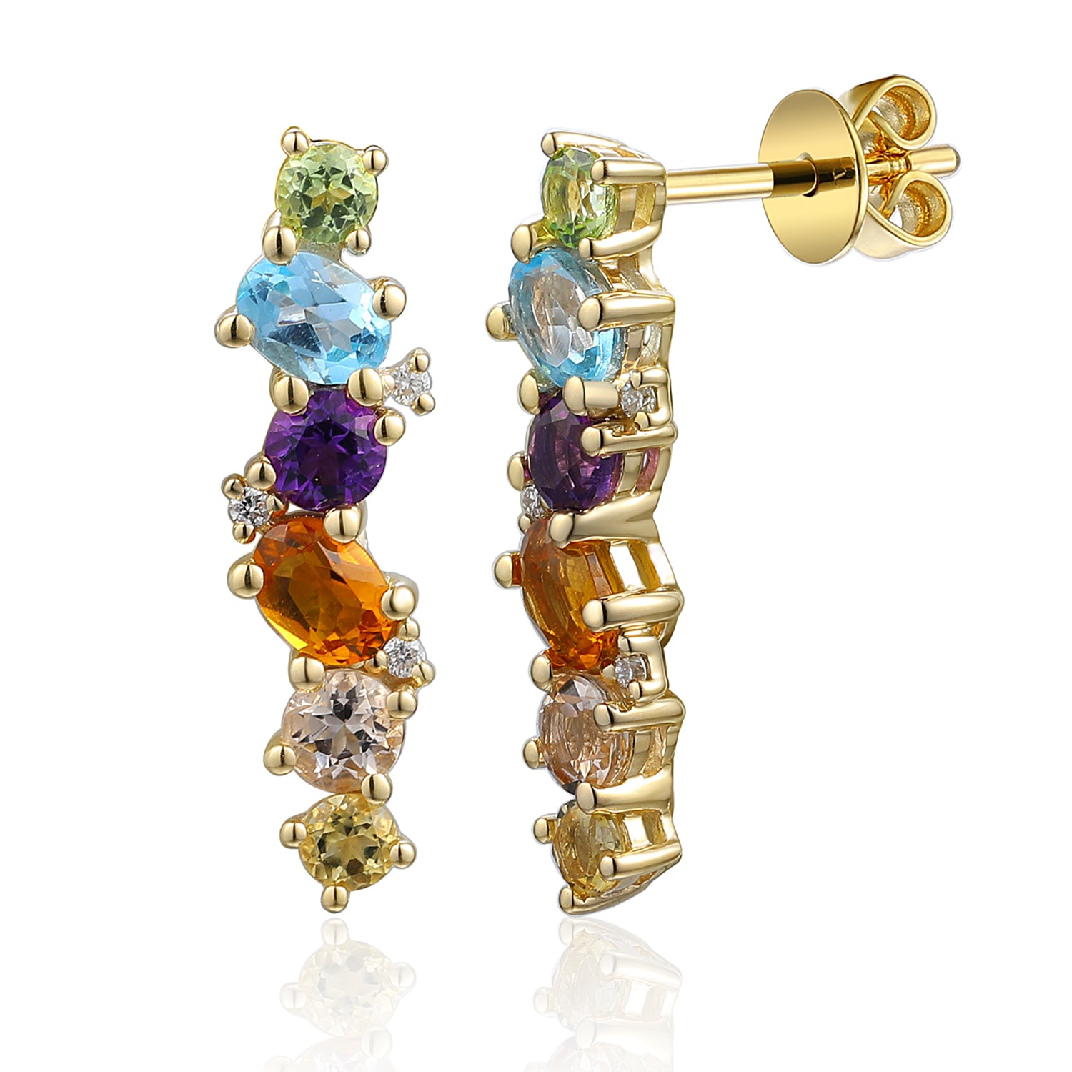 Multicolour round and oval shaped drop straight earrings with diamonds on post and butterfly fastening.